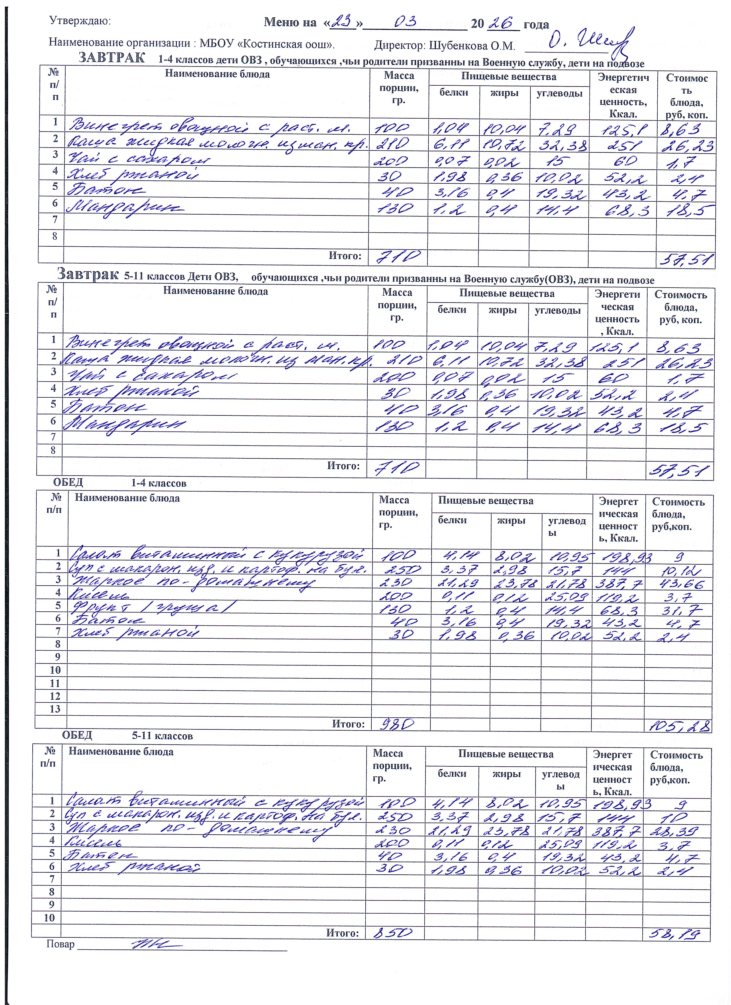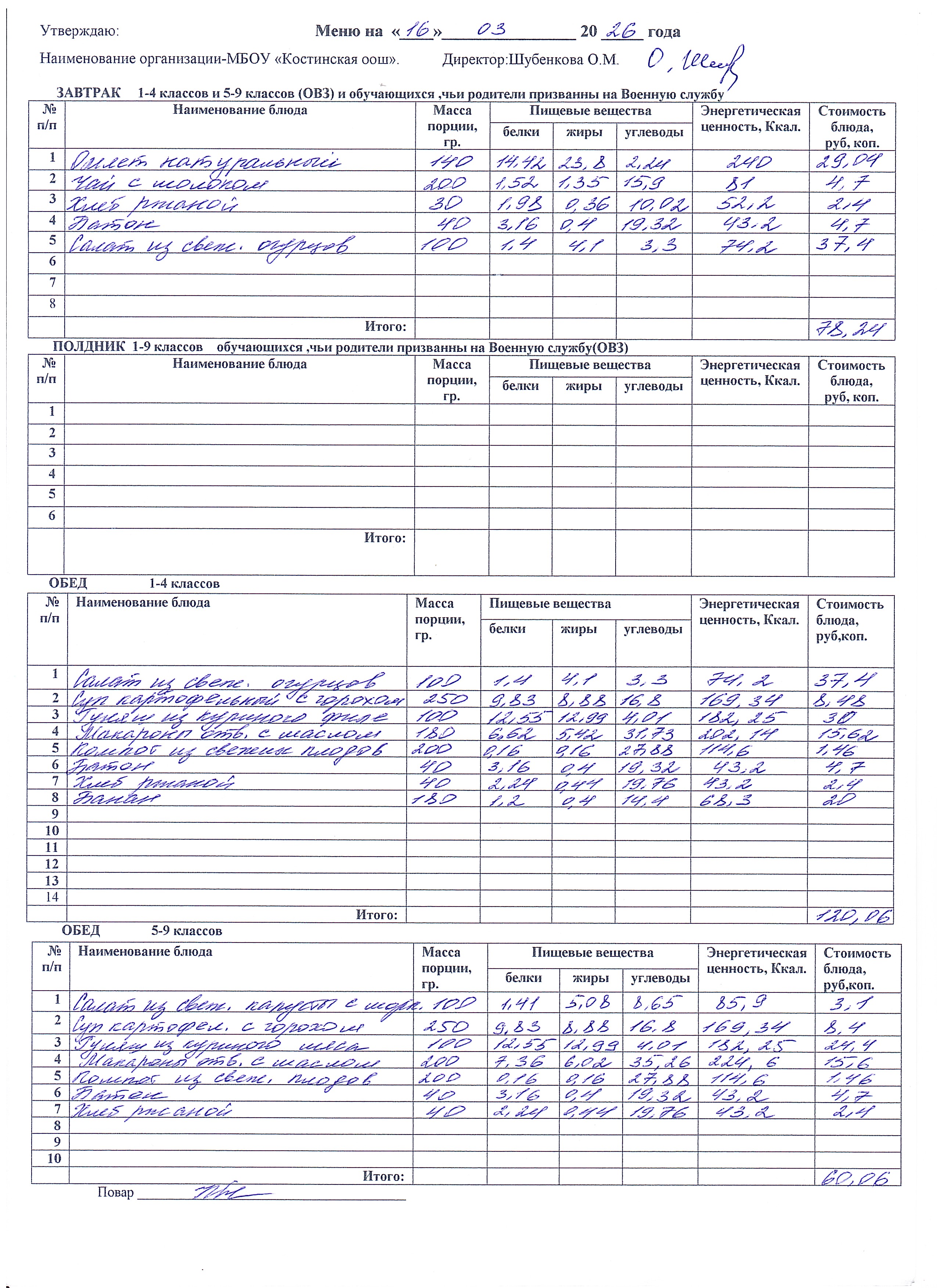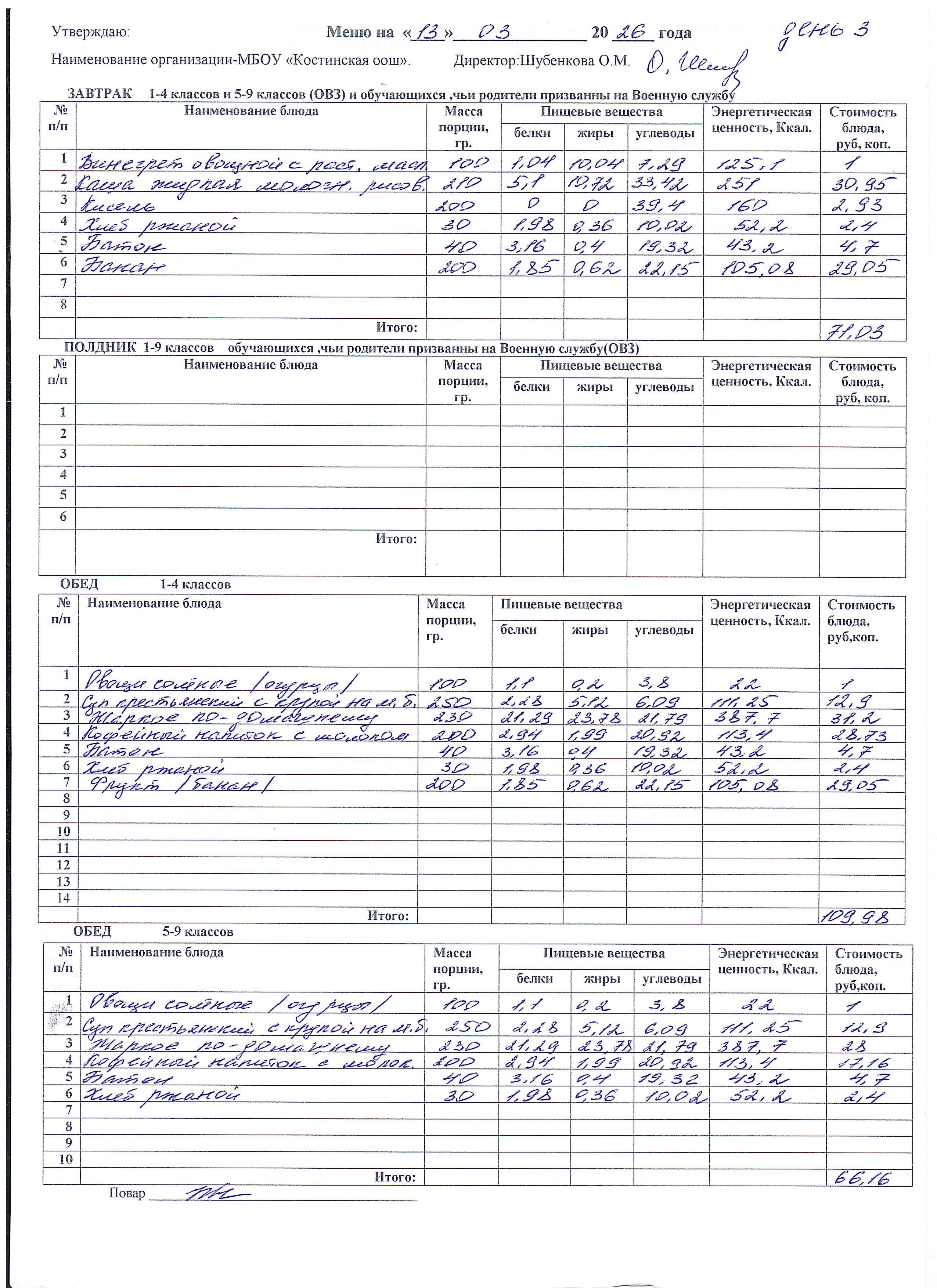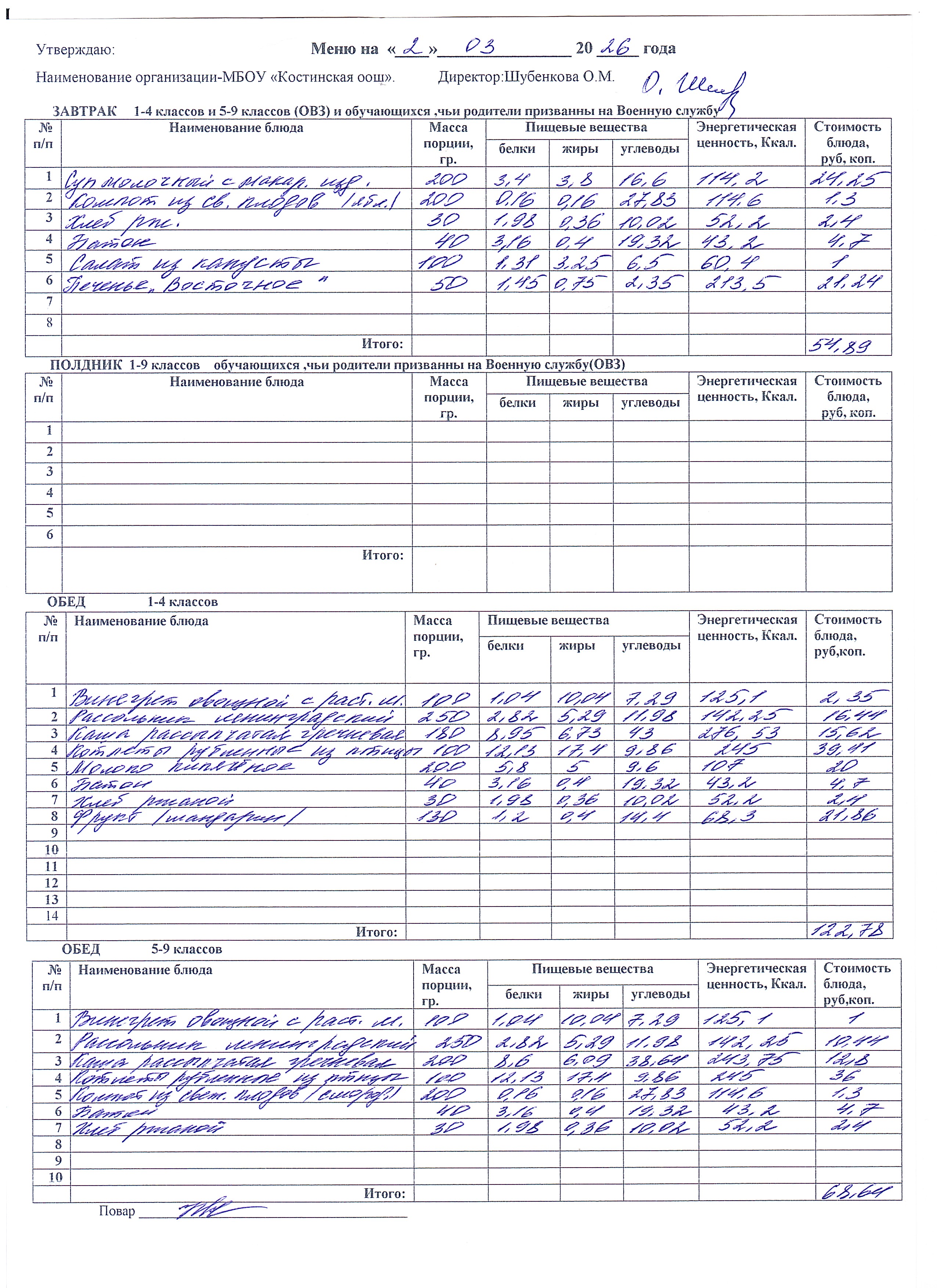 Меню ежедневного горячего питания