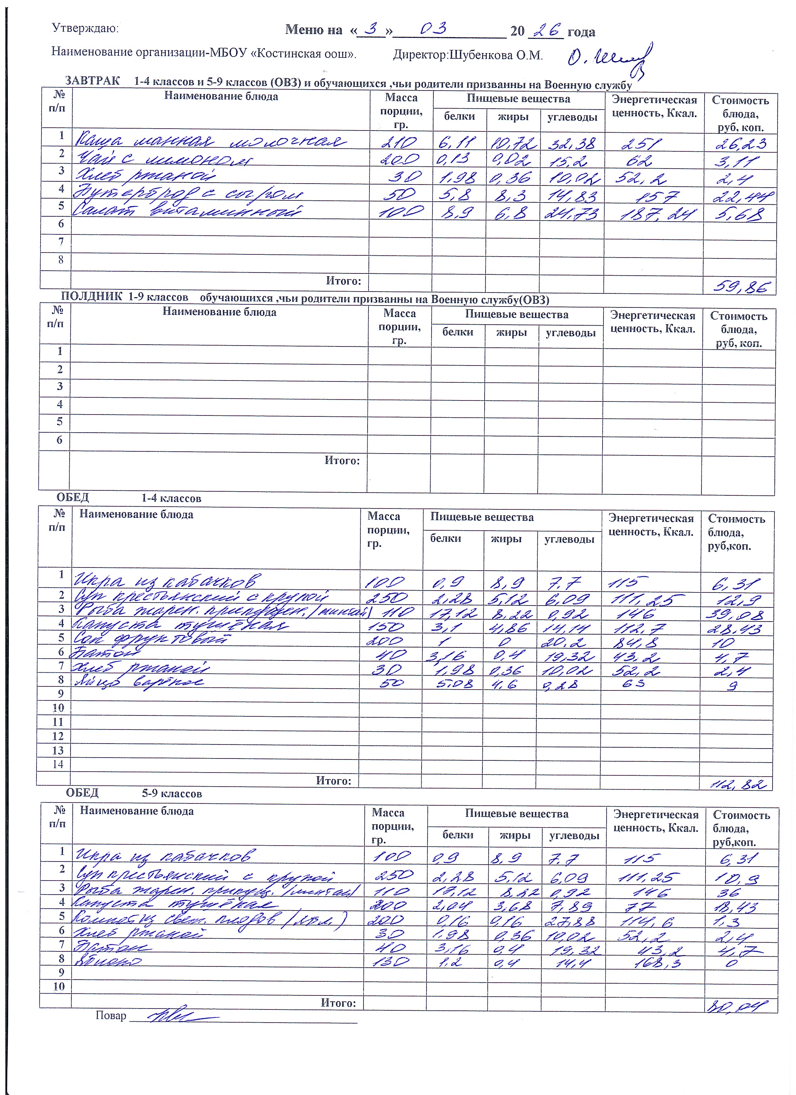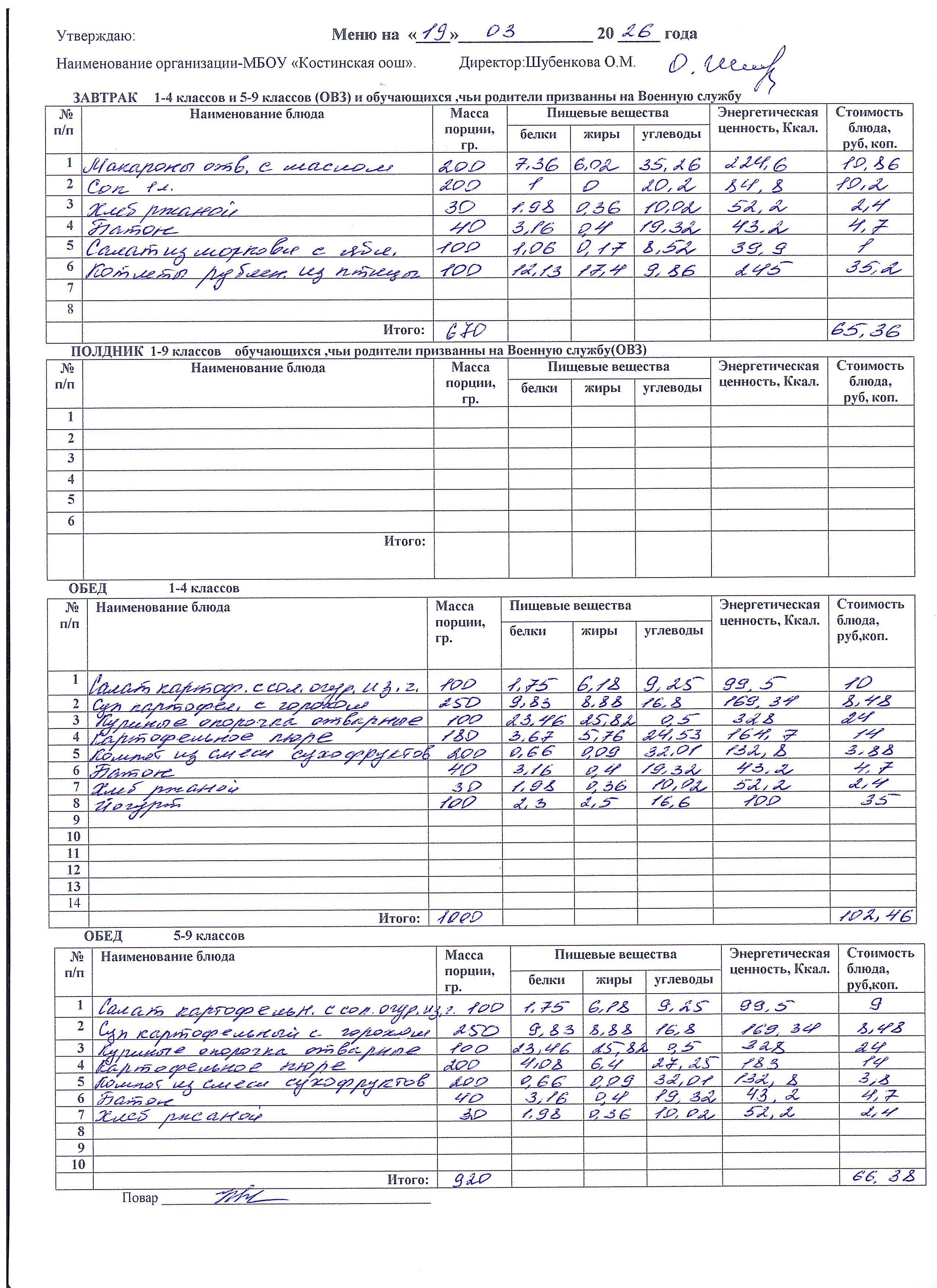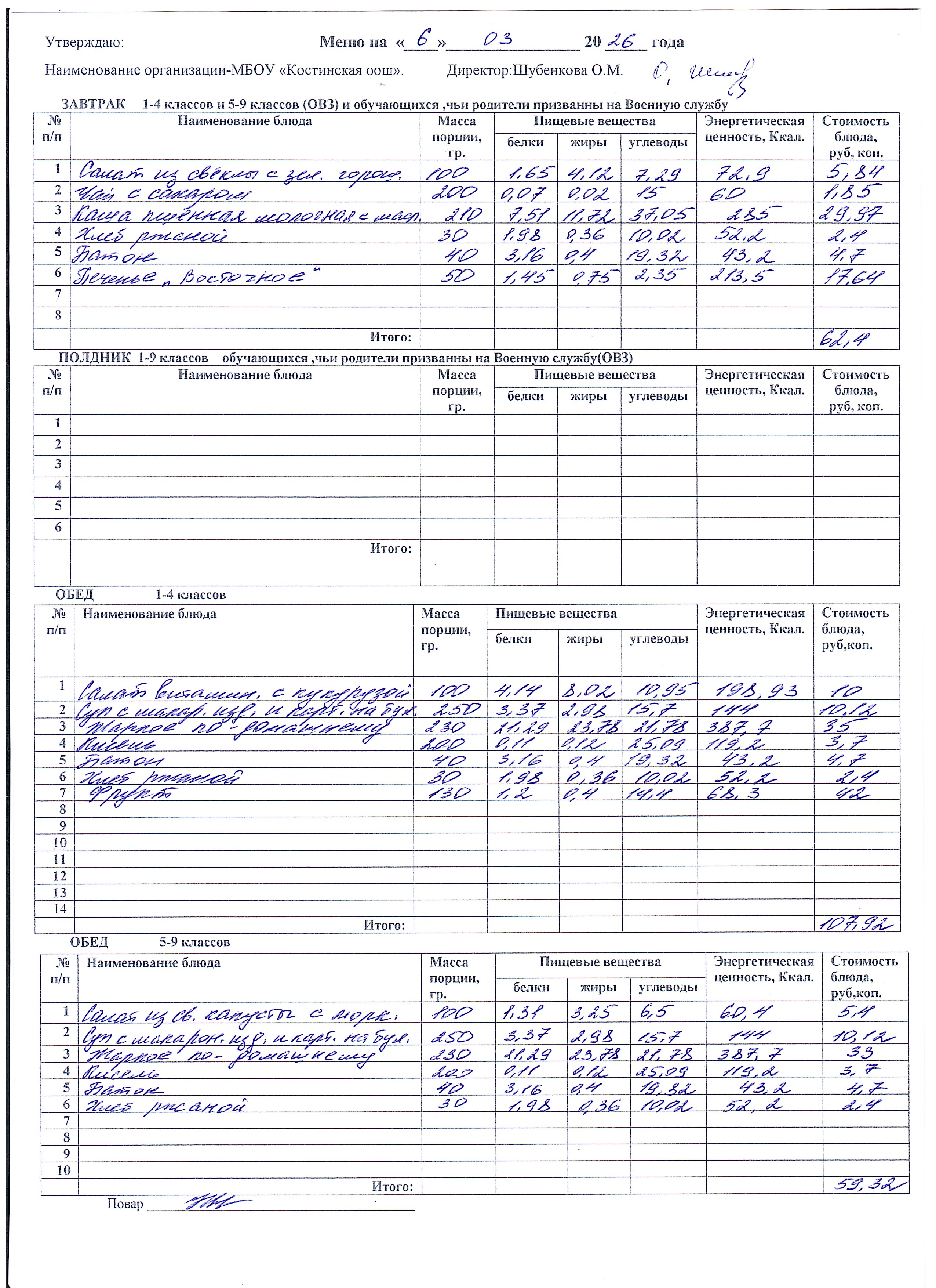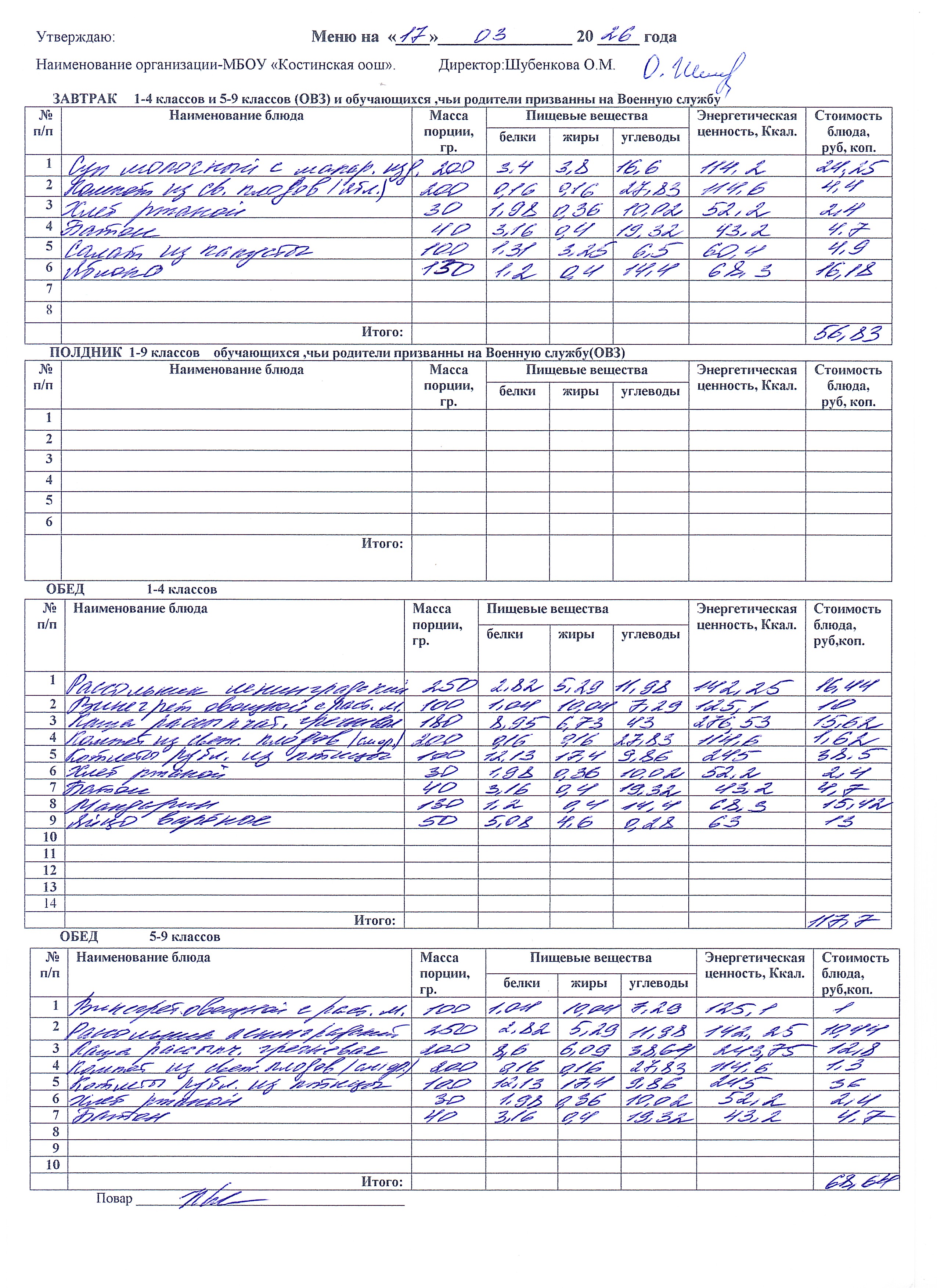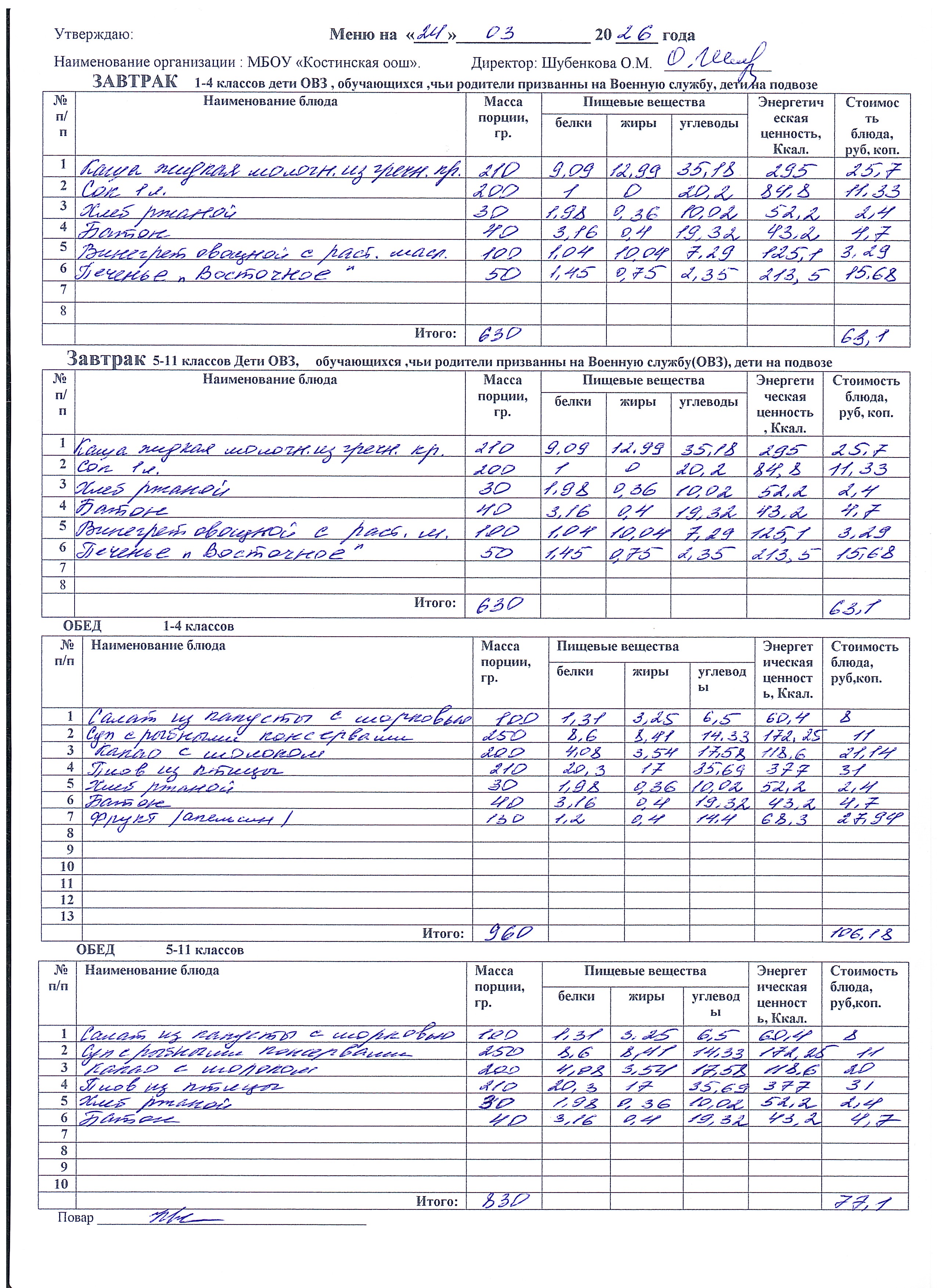 Меню ежедневного горячего питания