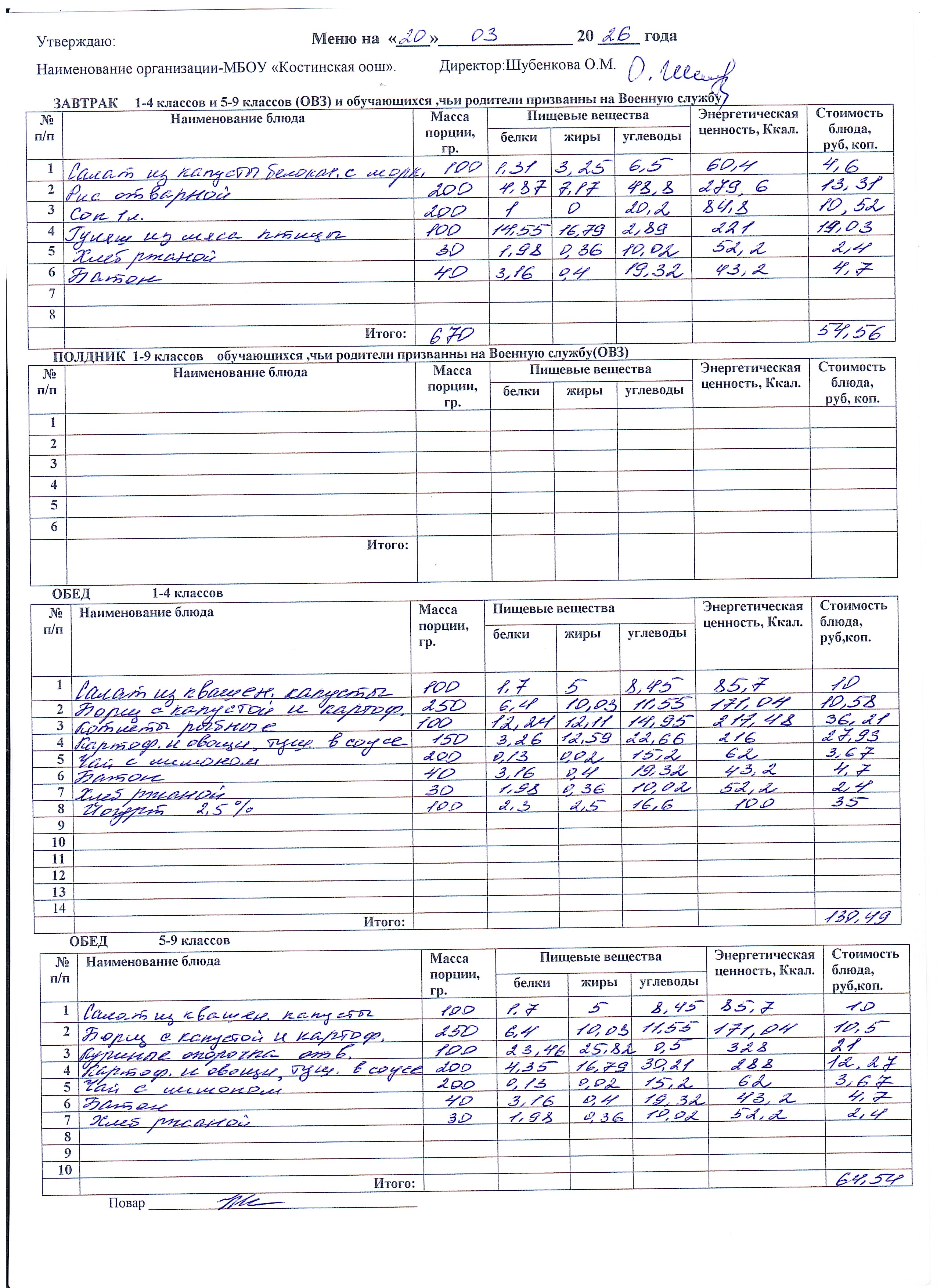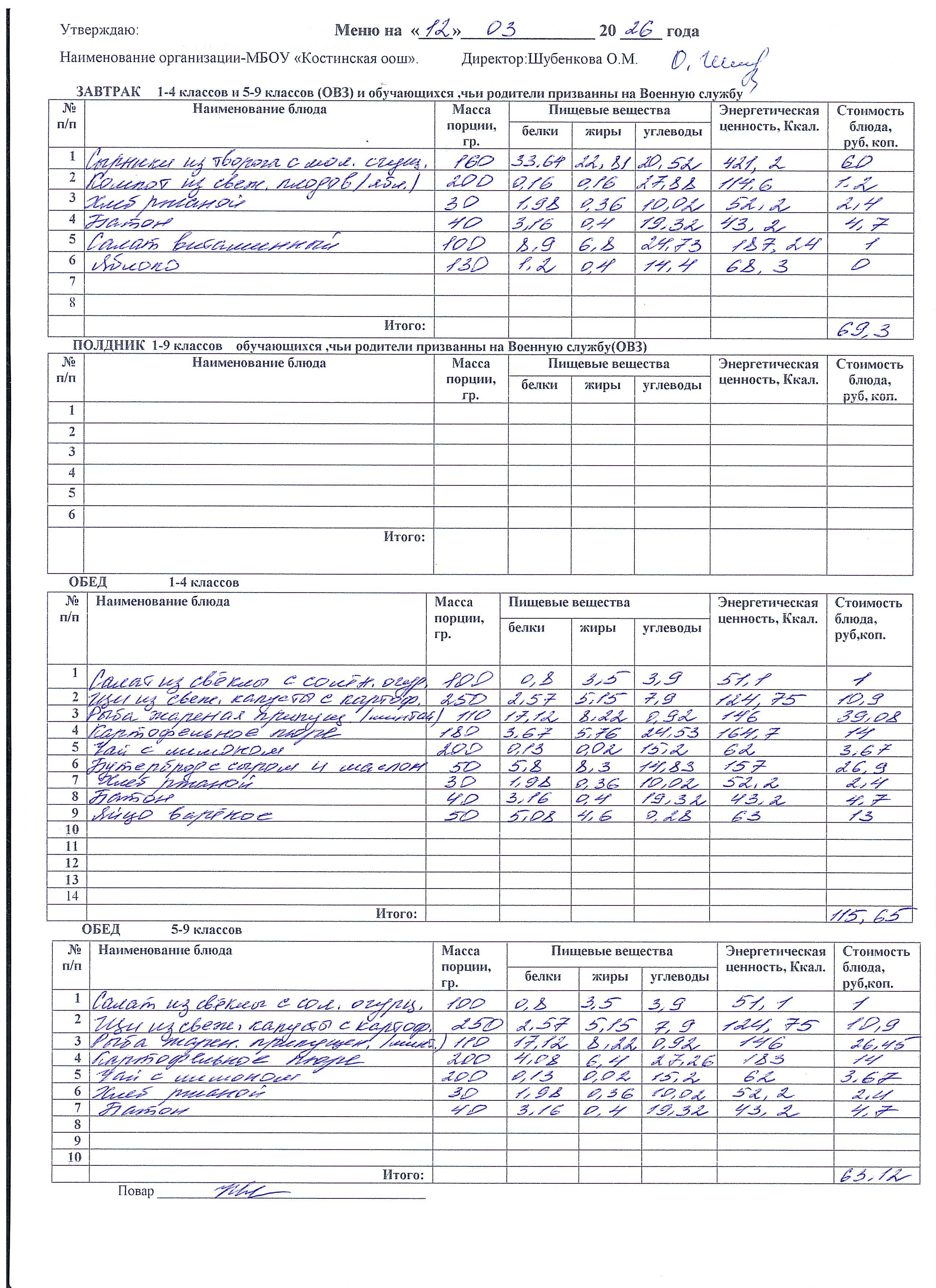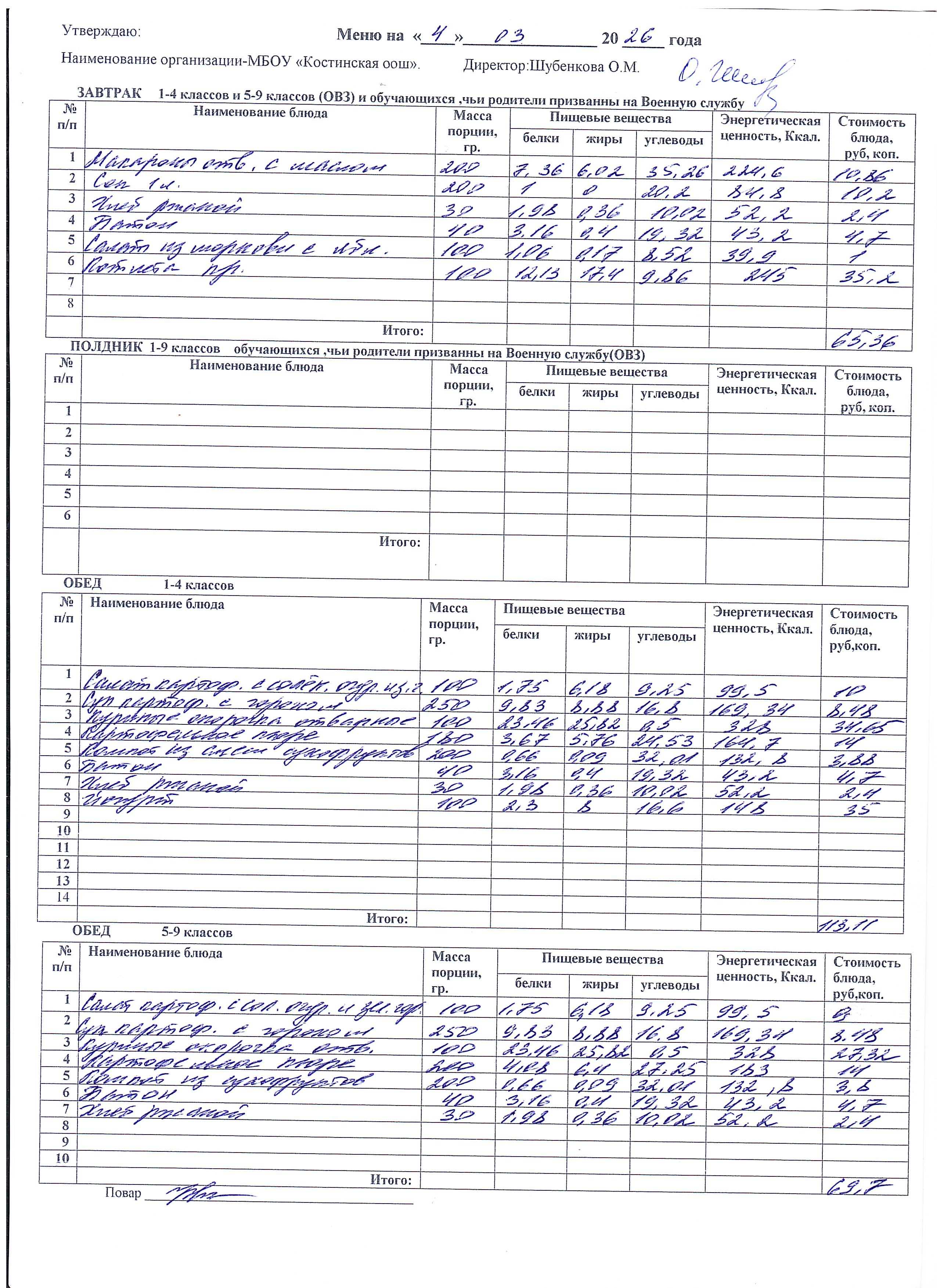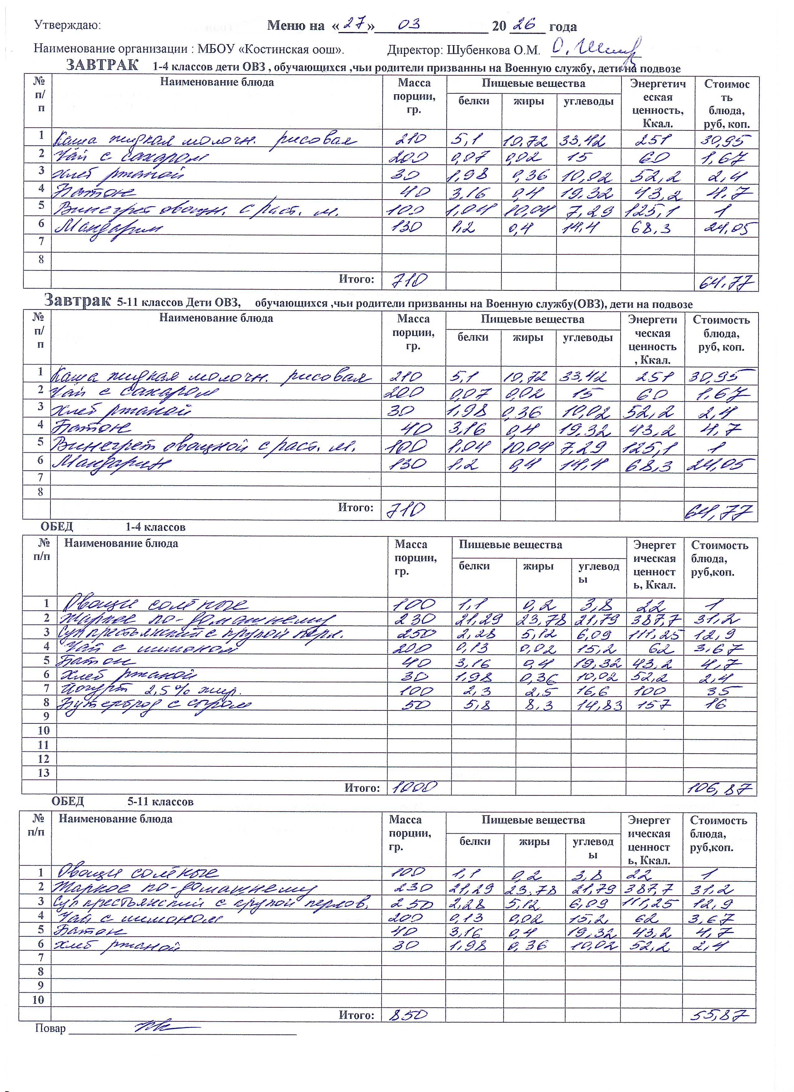 Меню ежедневного горячего питания