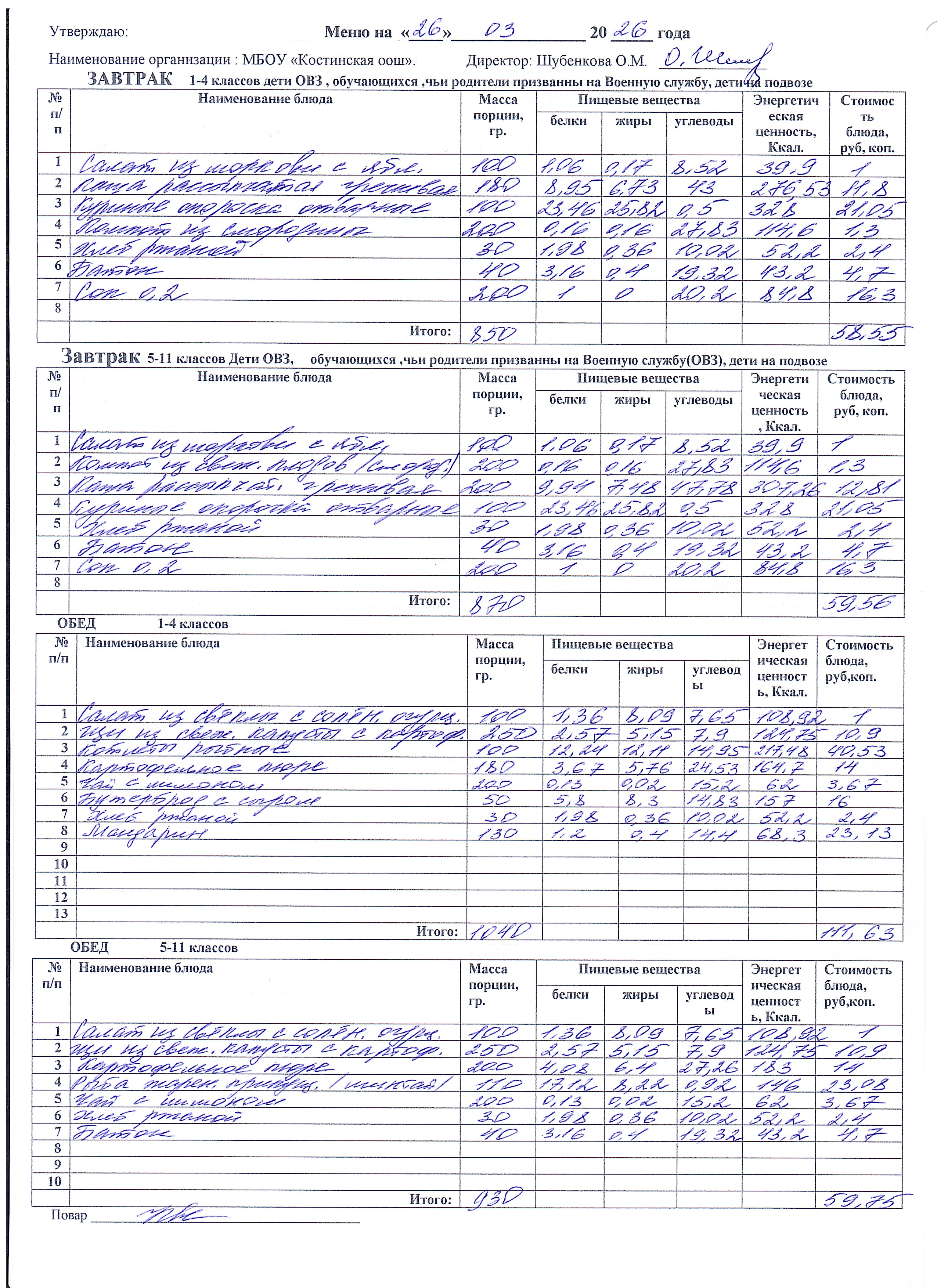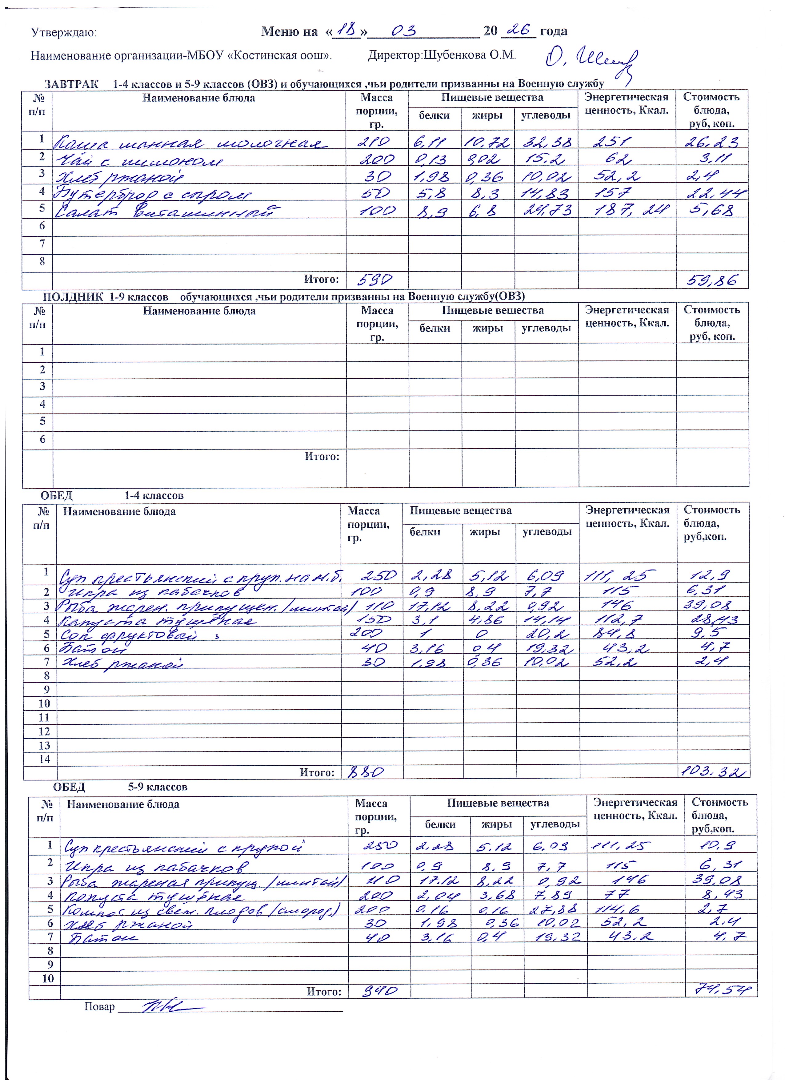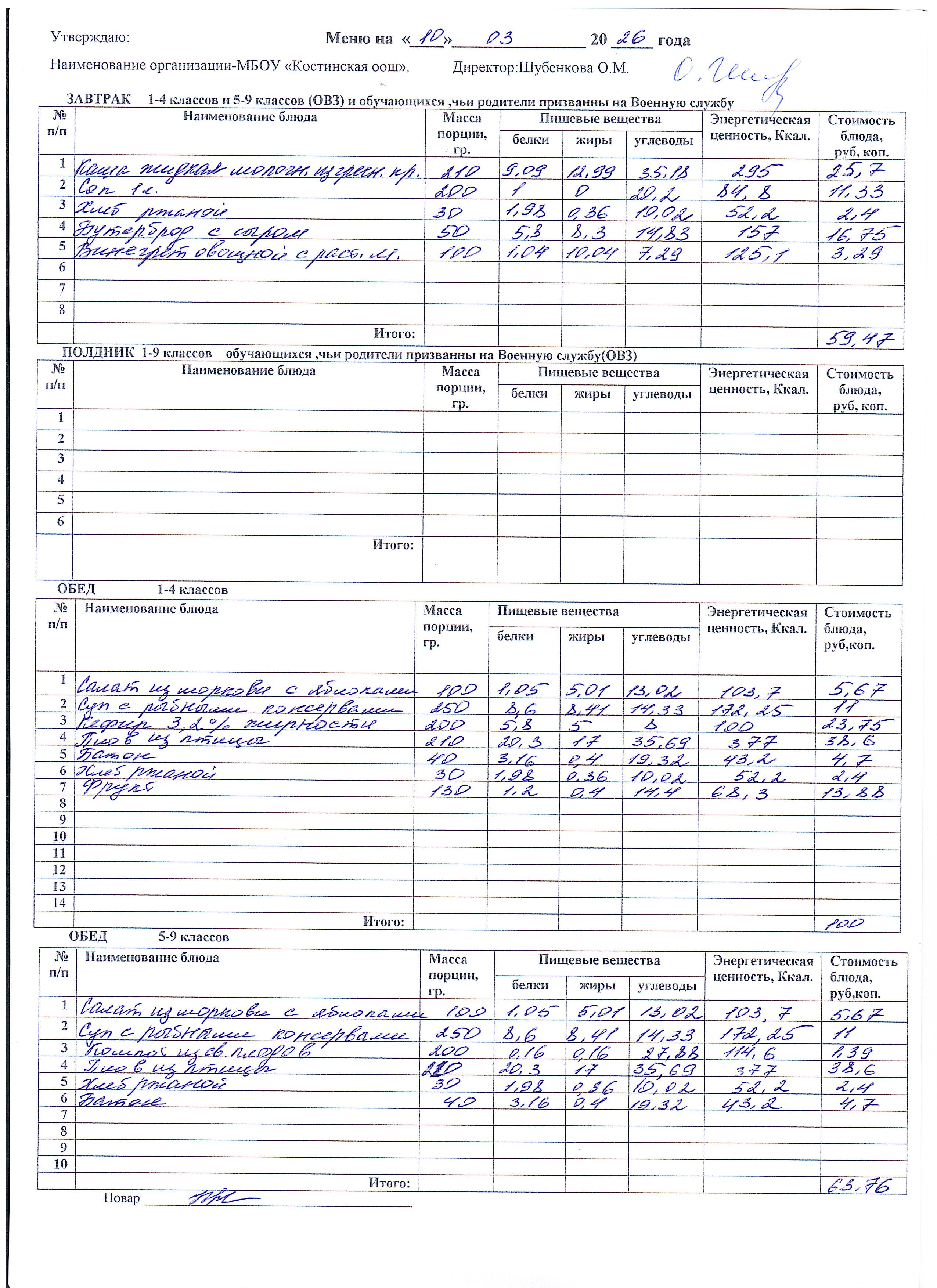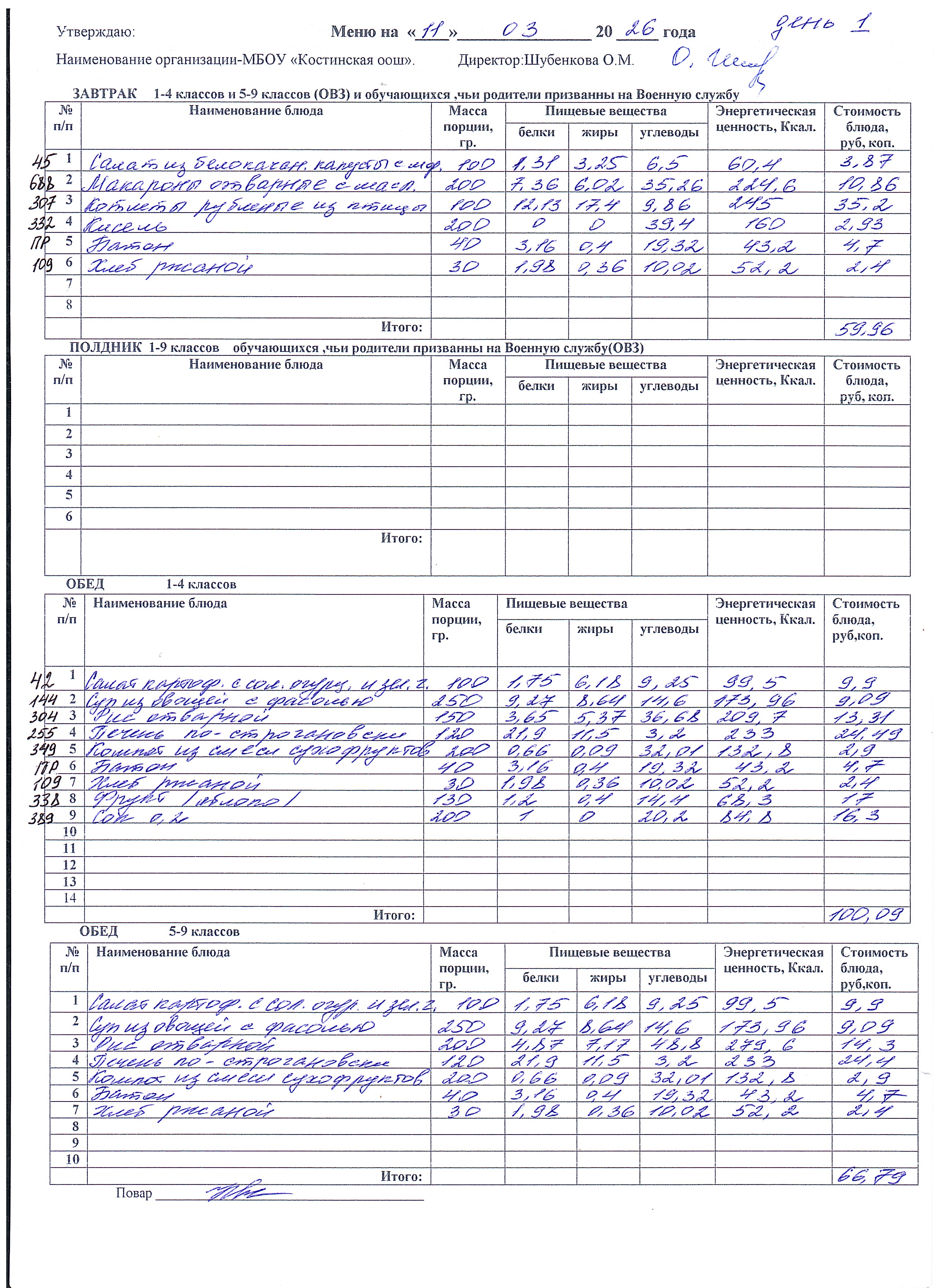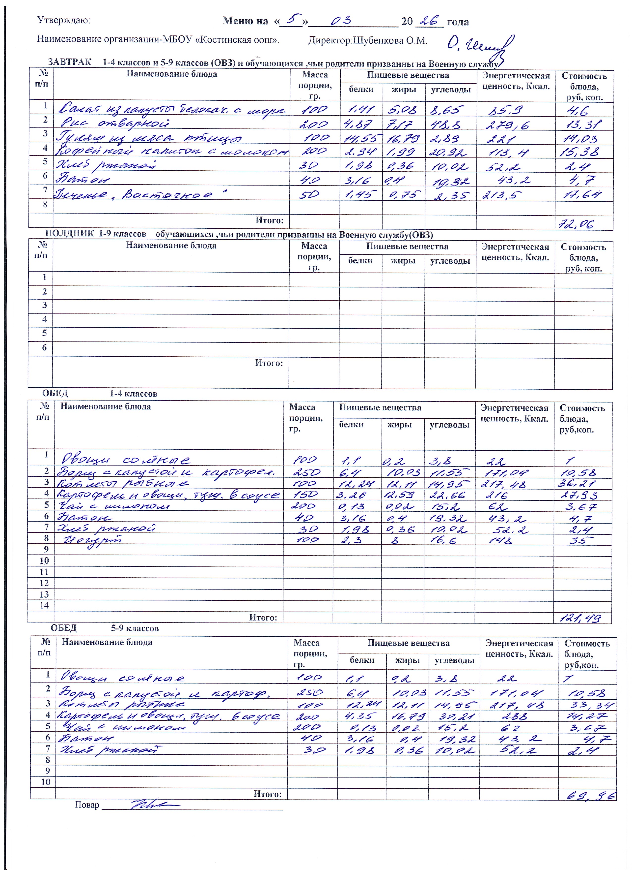 Меню ежедневного горячего питания