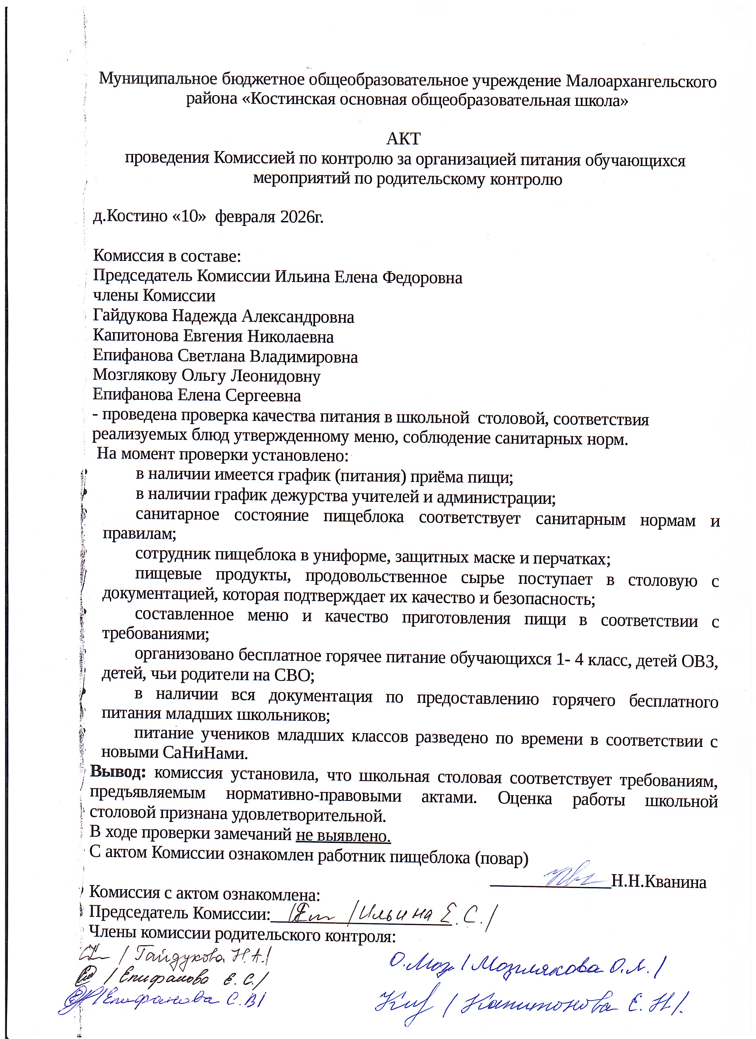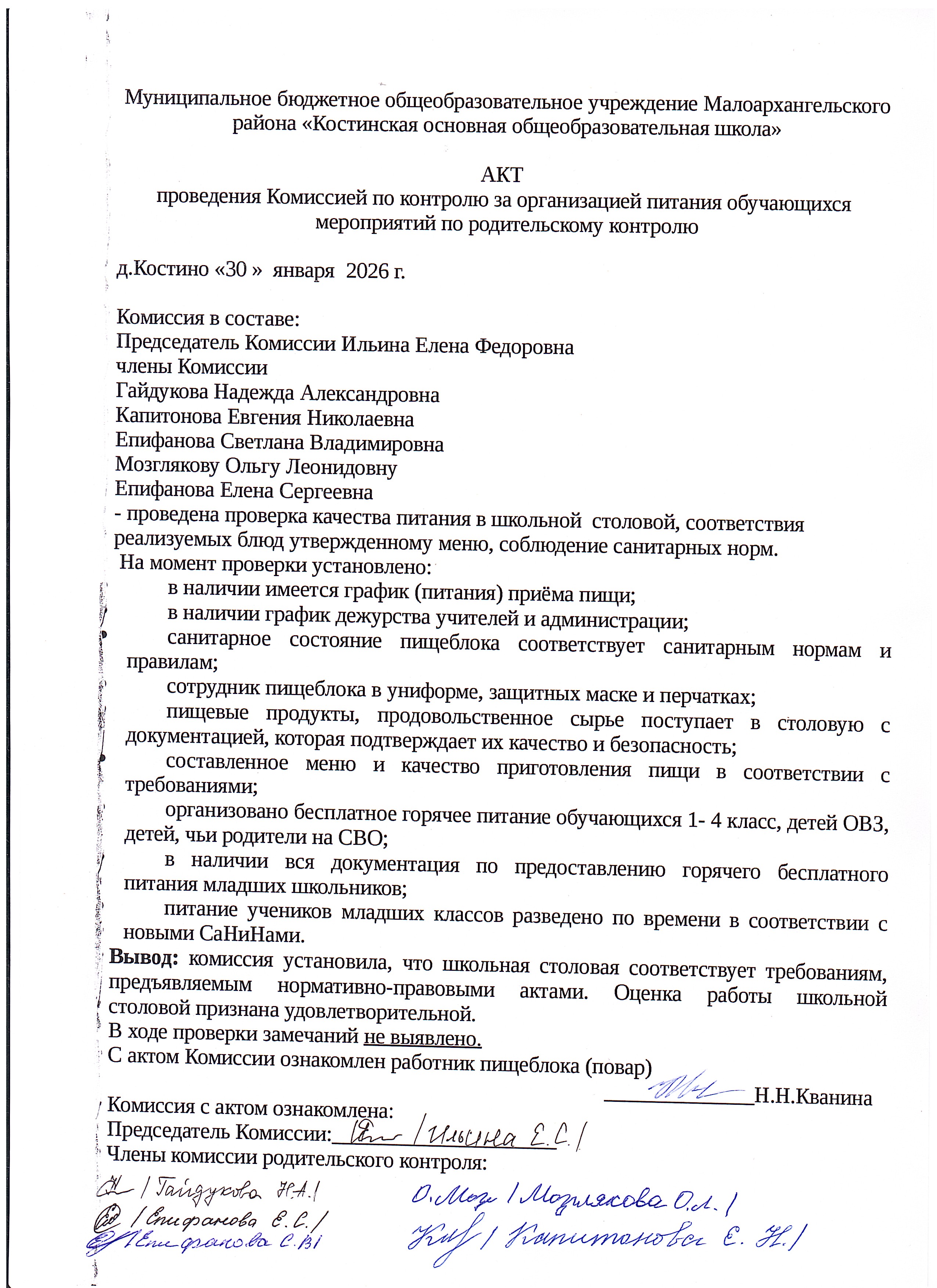 Протокол проверки организации горячего питания в школьной столовой